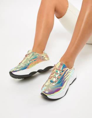 No 1 ASOS design Dare Chunky trainers are beautiful . They have a rainbow sheen and will go wonderfully well with leggings , tracksuit bottoms or a nice long skirt to the local . At 24 pounds down from 40 it's a bargain . I love them .